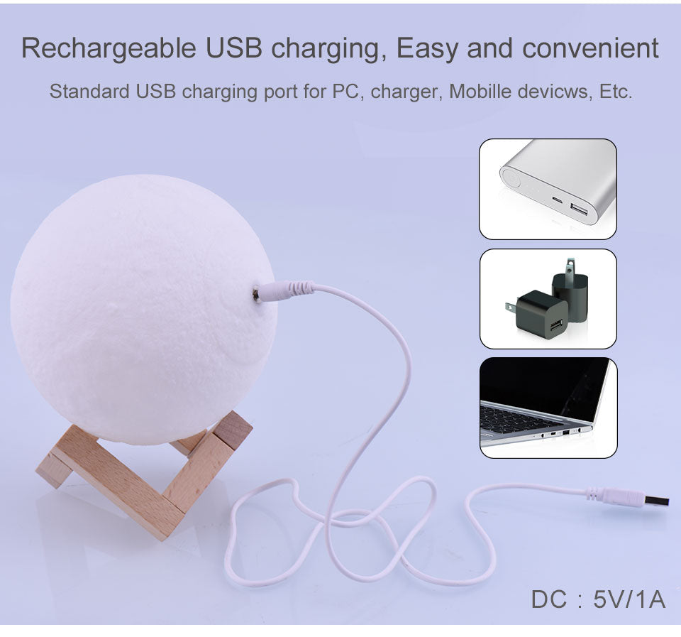 4. The built-in rechargeable battery moon light can be charged in the computer / power supply or charging adapter. Charge 2-3 hours, works for 8-10 hours.